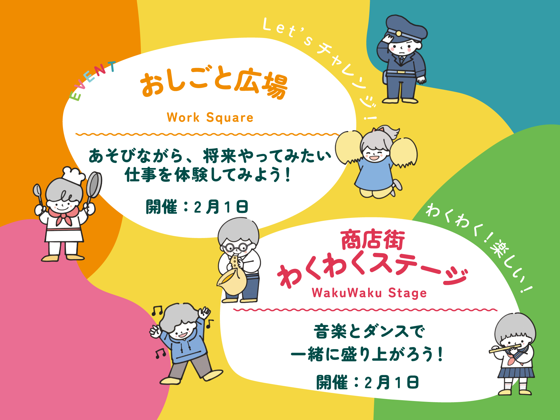 商店街で職業体験、マーチングバンド、音楽やダンスのステージなど、楽しいイベント盛りだくさん!